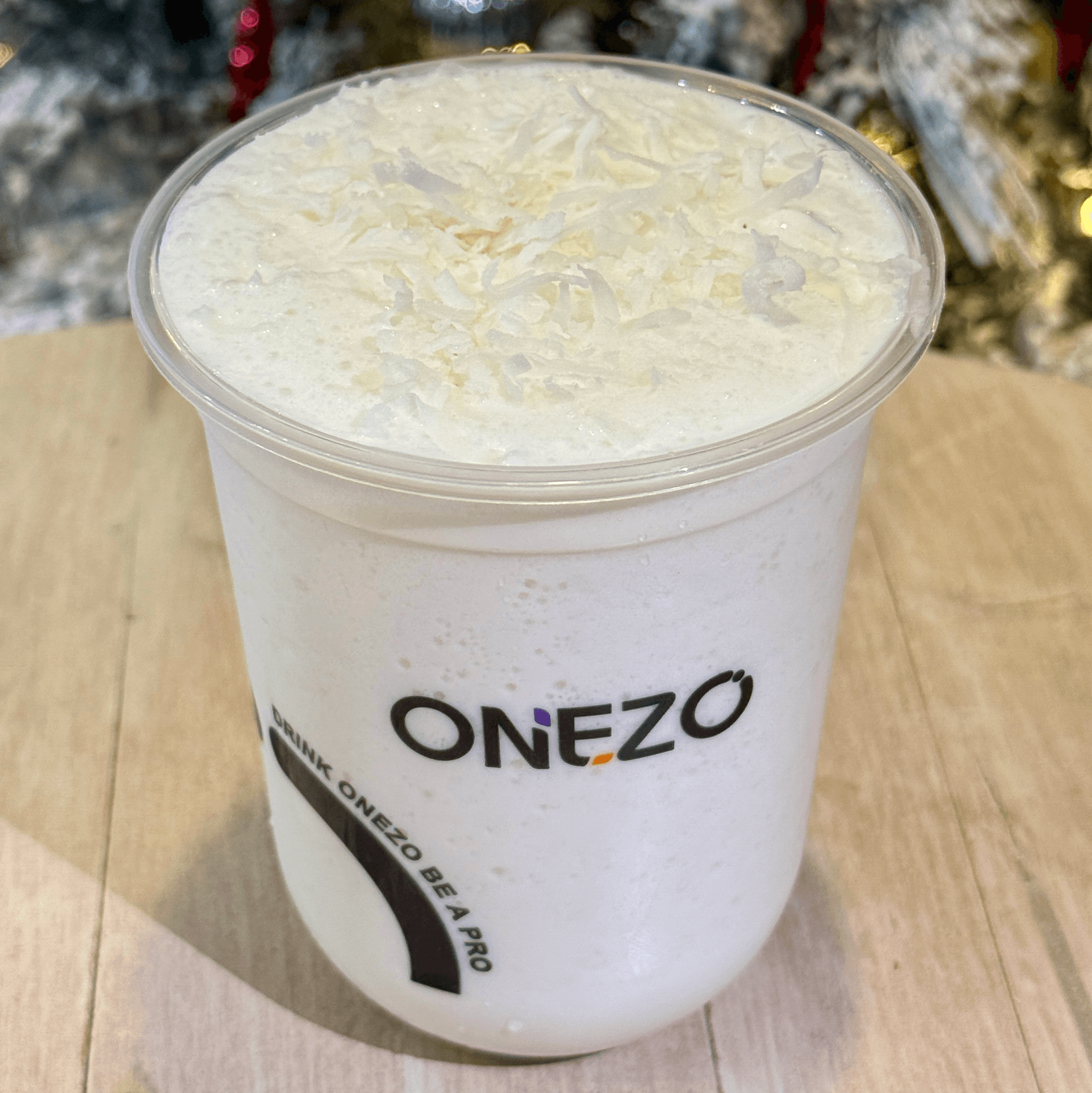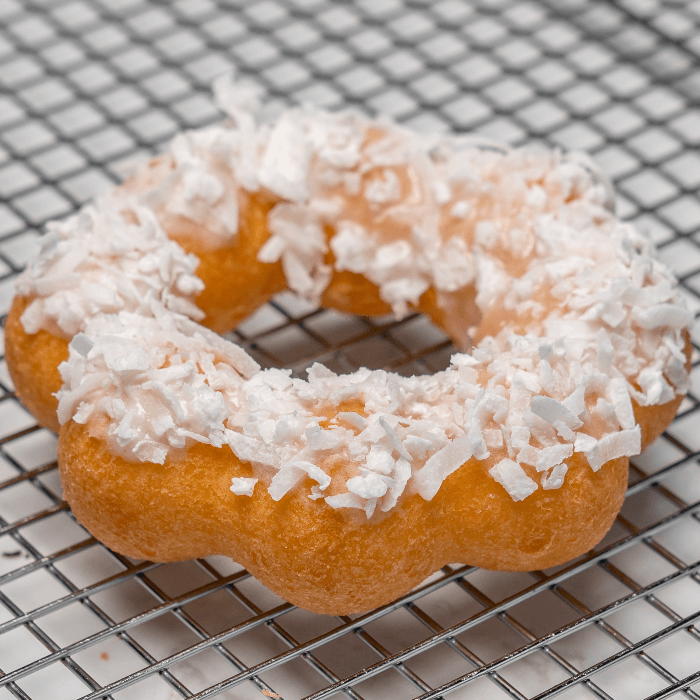 Mochi donut topped with coconut flavored icing and coconut flakes