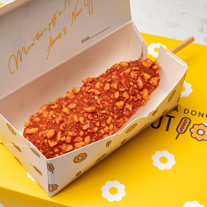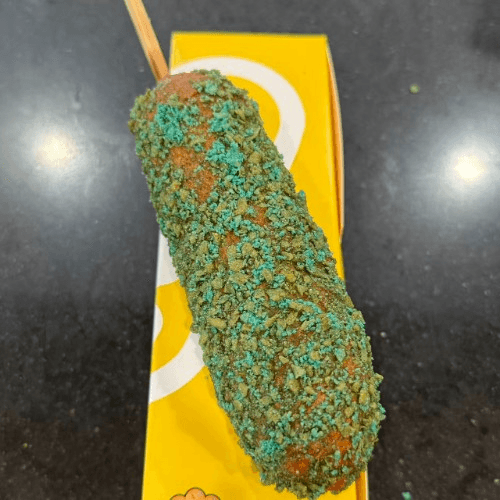 Half hot dog, half mozzarella coated in rice flour batter and coated with Hot Cheetos, deep fried to perfection.