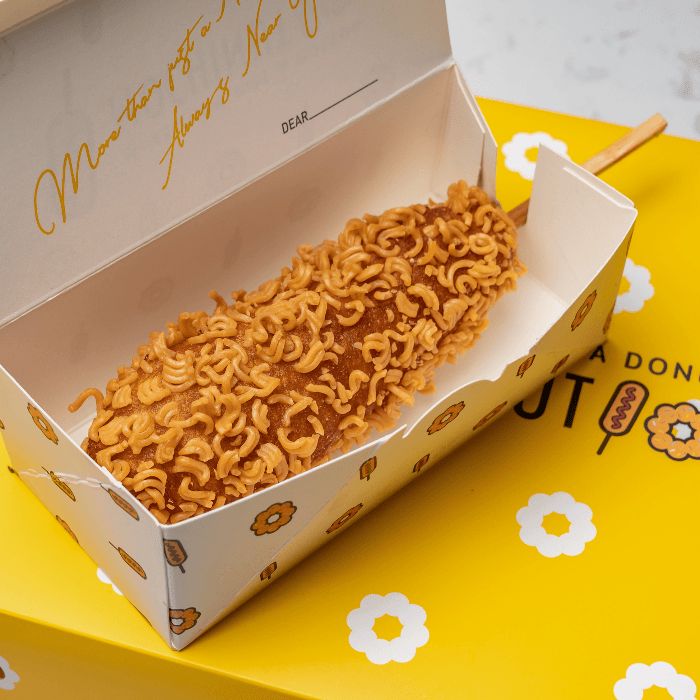 Mozzarella-dog coated in rice flour batter and coated with crispy ramen, deep fried to perfection.