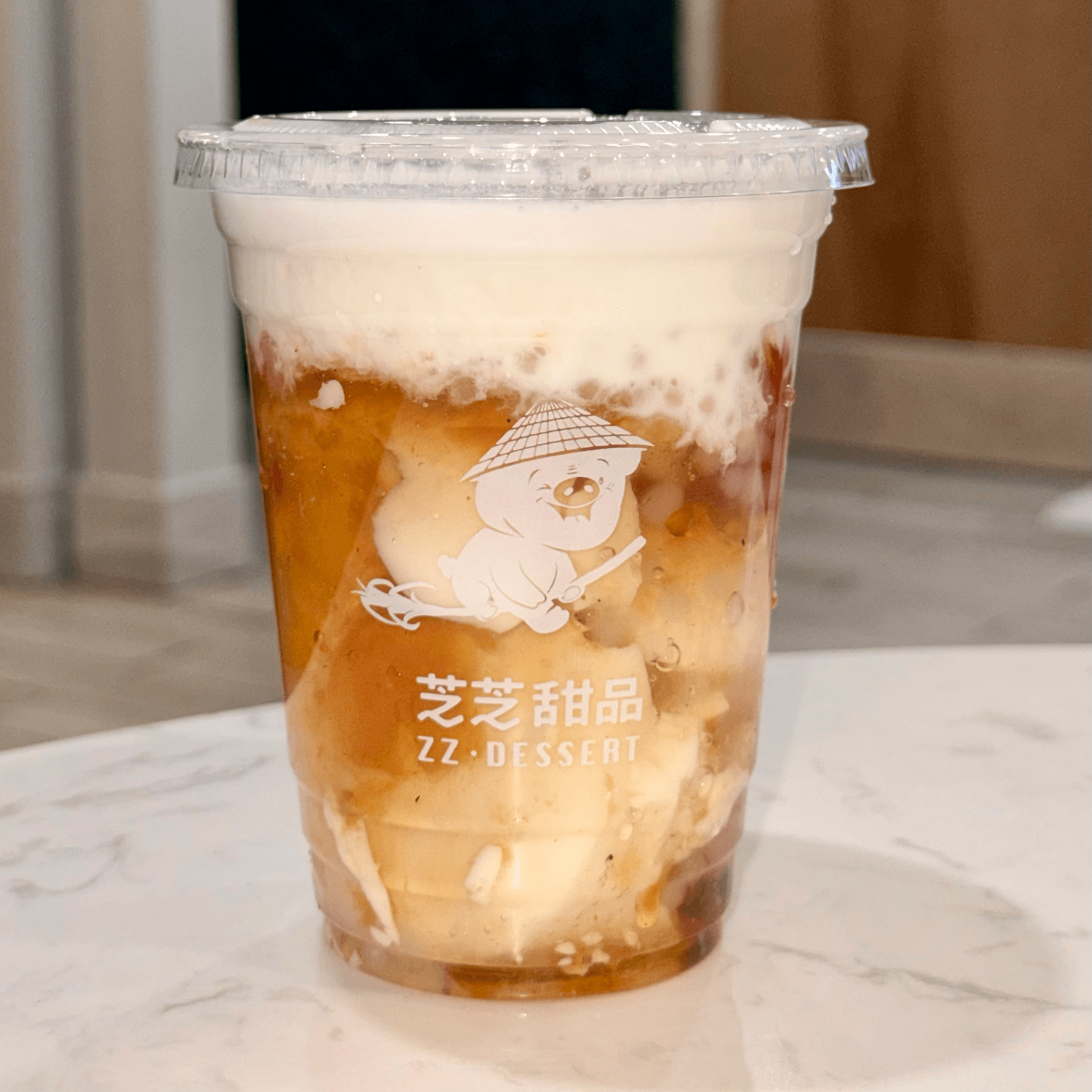 Taro ball, sweet potato ball, red bean, coconut milk, herbal jelly, boba.