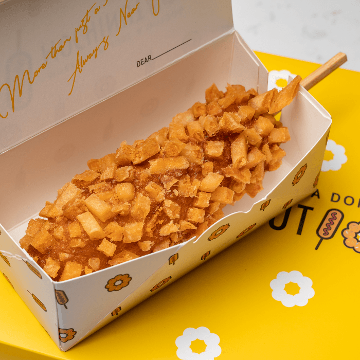 Mozzarella-dog coated in rice flour batter and covered with potatoes, deep fried to perfection.