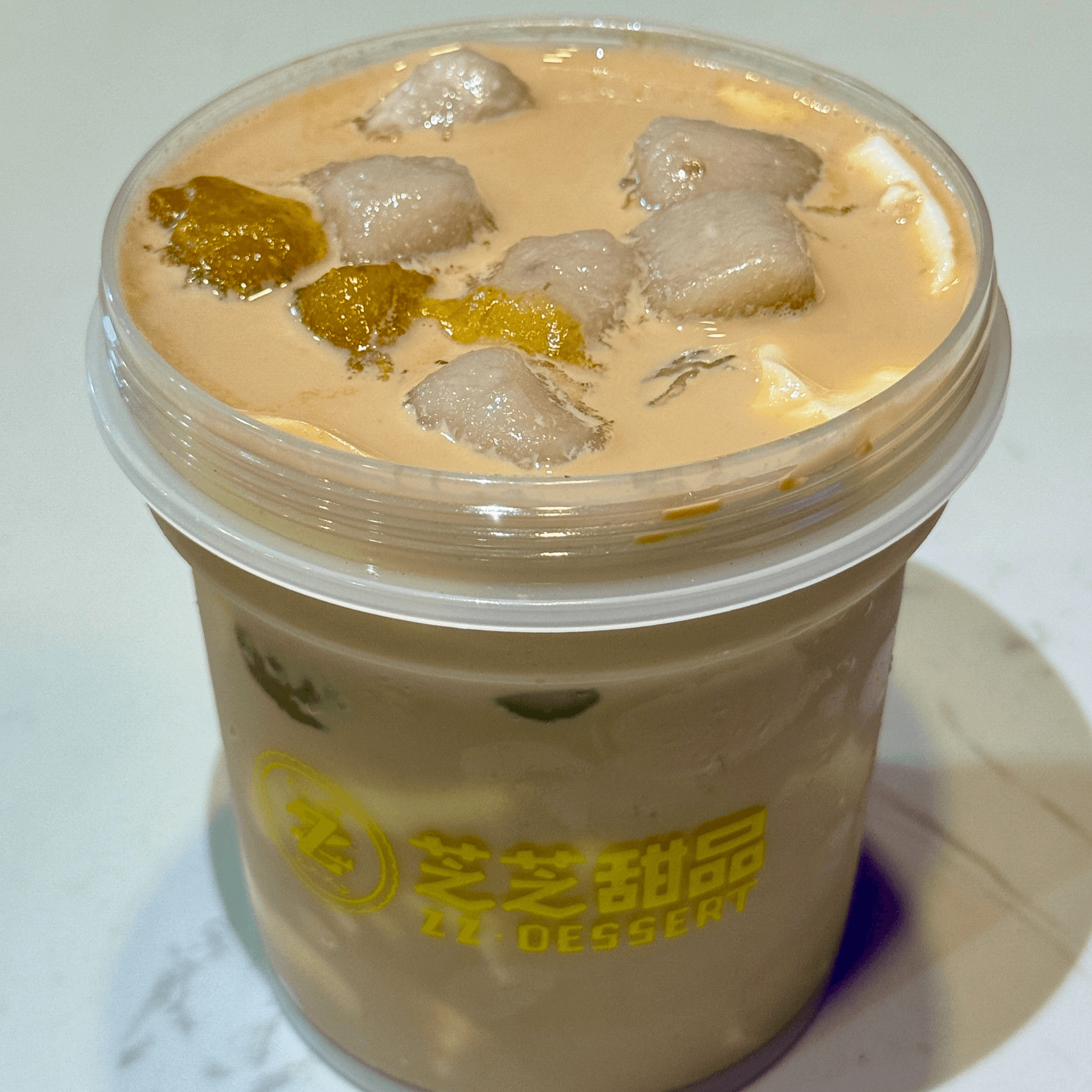Milk, papaya peach gum, taro ball, coconut milk.