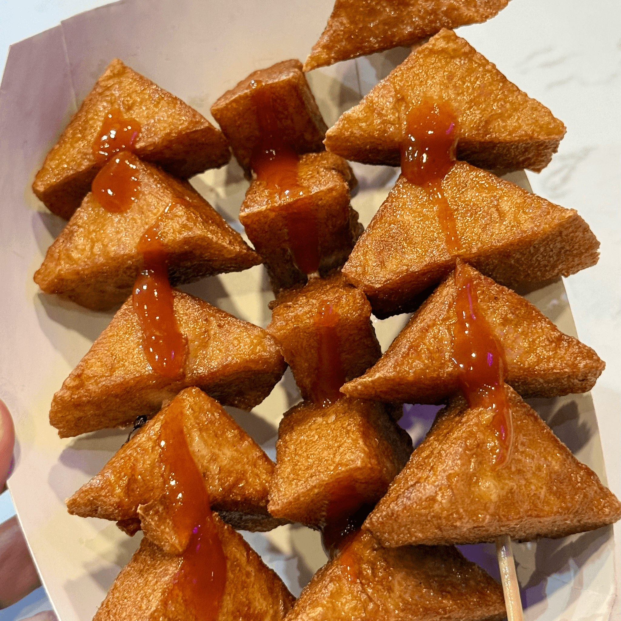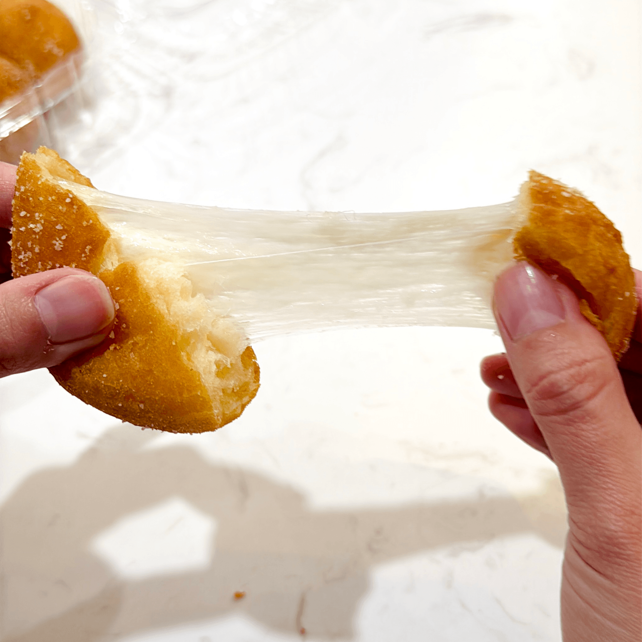 Mozzarella-dog coated in rice flour batter, deep fried to perfection.