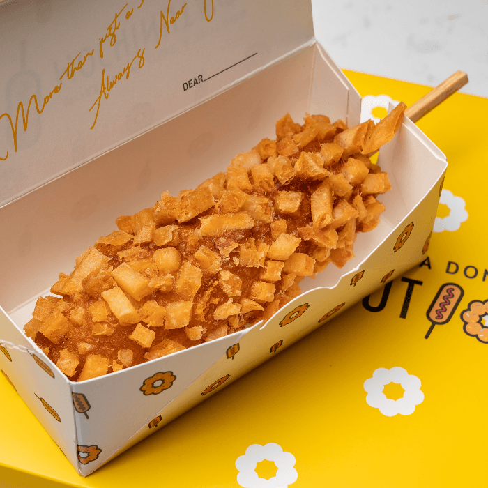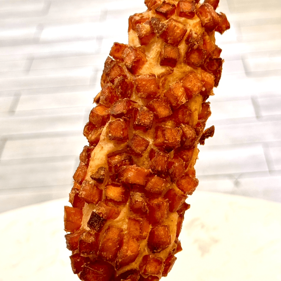 Half hot dog, half mozzarella coated in rice flour batter and covered with potatoes, deep fried to perfection.