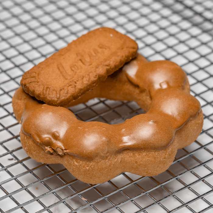 Mochi donut topped with coffee flavored icing and a whole Biscoff cookie