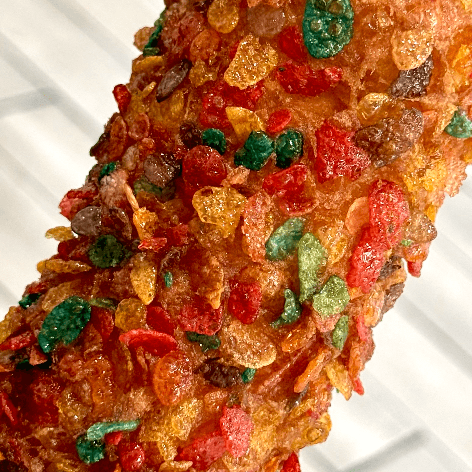 Coated with crunchy fruity pebbles