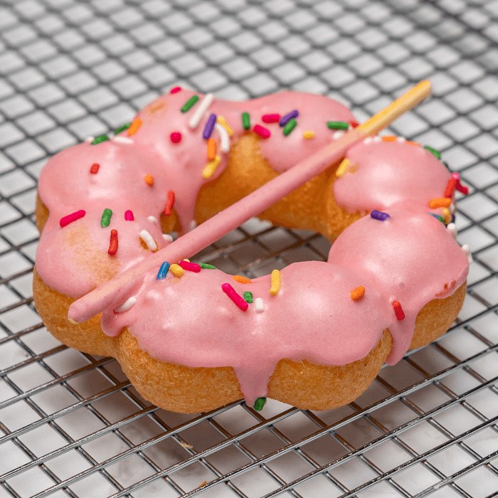 Mochi donut topped with strawberry icing, rainbow sprinkles, and a strawberry Pocky stick (topping may varies)